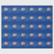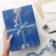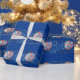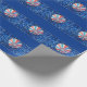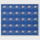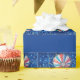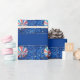 A colorful aerostatic hot air balloon seen from below sits against a deep blue, starry background. The design is vibrant with red, white, and blue segments, surrounded by scattered small yellow and white accents.