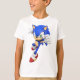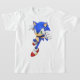 En blå Sonic t-shirt-design har vanligtvis den ikoniska karaktären Sonic the Hedgehog, i sitt namnteckning ljusblå färg. Han kan beskrivas i ett dynamiskt läge, i hög hastighet eller helt enkelt stå tryggt. Formgivningen kan vara inriktad enbart på Sonic själv, eller så kan den innehålla ytterligare inslag från spelen som ringar, Chaos Emeralds eller till och med andra karaktärer från Sonic-universum.