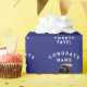 Kreativ studenten klackar för klass "25 grad" med svart studentmössa med guld tassel på blå bakgrund. Om du vill anpassa redigeringstexten så att namn läggs till.
