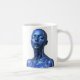 Futuristic blue metallic female android with closed eyes, centered on a white mug.