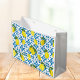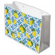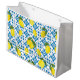 This gift bag features a watercolor French country tile and lemon pattern in blue and yellow.