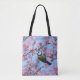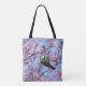 En blå målfågel från Eurasien, Cyanistes caeruleus, som klingar och hänger ner från gren i en rosa blommar körsbärsfärs blommar träd i vår. Ett vackert fågelfoto taget av Katho Menden. Den här väskan är en presentidé för älskare.