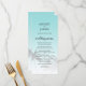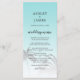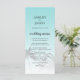 Elegantens bröllopsmeny med en ritning av det tropiska handflatan träd på en ljusblå bakgrund med elegant och modern typografi. Havets snäcka blått tonas ut mot en vit bakgrund. Lägg bara till dina uppgifter om bröllop till den här snyggten på bröllopsmenyn för tropisk strand. Enbart designad för dig av Lycklig Dolphin studio.