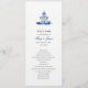 Ett enkelt program och ett program i elegant bröllop med vattenfärgbilder av en blå och vit kyrka.