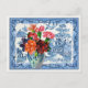 Färgblommor i vas finns framför ett traditionellt blått blad. Den blå mönstren i vas ekar färg och stil i den asiatiska inspirerade bakgrunden. De ljusa blommorna har en contemporary som ser ut trots att de trycktes på ett antikt Viktoriskt handelskort. Den här vackra bilden kan dekorera inbjudningar, tillkännagivanden och insida i ditt hem.