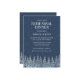 A rustic invitation for your winter wedding rehearsal dinner with a snow covered night forest with elegant text in navy blue and white.