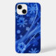 Blå juldesign med dekorativa vsnurrar och snöflingor.