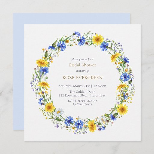 Celebrate the bride-to-be with a charming wildflower wreath design featuring delicate blue, sunny yellow, and soft lavender blooms arranged in a graceful circular shape. This watercolor-inspired wreath evokes a fresh spring meadow and adds a romantic, rustic touch to bridal shower invitations, décor, or favours. Perfect for garden-themed showers or countryside celebrations, this floral wreath brings natural beauty and a sweet sense of joy to the special day.