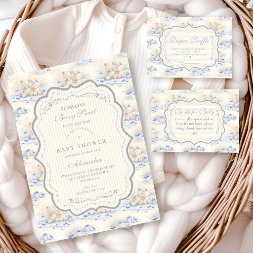 A sweet vintage-inspired design featuring delicate blue bows, soft striped detailing, and charming blueberry garden illustrations. Toile-style artwork with adorable animals and fruit baskets creates a classic storybook feel in a soft powder blue palette. The ornate central frame adds elegance while keeping the overall look light, refined, and timeless. Perfect for a baby shower with a gentle garden theme and a touch of traditional charm.