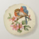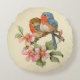 Vattenfärgsblått par sida vid sida på en gren av äppelbaserade blommar på krämbakgrund. Rund dekorativ kudde har en diameter på 16 tum.