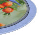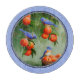 Två westerna bluebirds färdas i persiko-träd medan en tredje blåfågel sitter på ett trä av basket som är fyllt med nyskördat redo för saluföring. Med en matchande blå mönstrad bakgrund.