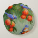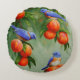 Två westerna bluebirds färdas i persiko-träd medan en tredje blåfågel sitter på ett trä av basket som är fyllt med nyskördat redo för saluföring.