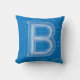 A detailed blueprint-style illustration of the letter B is presented against a vibrant blue background. The letter itself is rendered in white, with intricate details and precise measurements indicated by thin white lines. The back of the pillow includes a blue outline of the letter B set against a textured light beige background with a 4-line poem about the letter below.