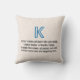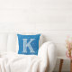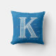 A detailed blueprint-style illustration of the letter K is presented against a vibrant blue background. The letter itself is rendered in white, with intricate details and precise measurements indicated by thin white lines. The back of the pillow includes a blue outline of the letter K set against a textured light beige background with a 4-line poem about the letter below.