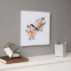 Das Bild zeigt ein elegantes Arrangement aus zwei großen, orangefarbenen Blumen mit zarten Blütenblättern, umgeben von kleinen rosa Blüten und grünen Blättern. Dazwischen schimmern feine rote Beeren, die dem Ganzen eine fröhliche Note verleihen. Es strahlt Ruhe und natürliche Schönheit aus, mit einem Hauch von Frische und Leichtigkeit.