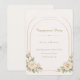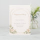 Elegant bågformad förlovningstema i mjuk rosa och varmt elfenben, med guldlinje ram, ömtåliga blommiga hörn och ren serif-typografi. Designad för par som är värdar för en polerad firande på en plats eller hemma med en balanserad, modern layout.