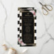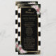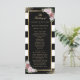 Elegant black and white striped floral wedding program featuring blush pink flowers and greenery framing the wedding details inside a gold frame against a black and white background adorned with gold confetti. Matching items available.