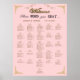 Why let the decor have all the fun when your seating plan can look this good. A soft blush pink backdrop with shimmering champagne gold accents sets a romantic upscale tone while graceful script calligraphy and bold easy to read names keep everything polished. The alphabetical layout with table numbers makes finding a seat stress free so guests spend less time searching and more time celebrating. From glamorous ballroom receptions to rustic vineyard weddings or chic garden soirees this seating poster blends seamlessly into any style. Proof that even the most practical detail can pull double duty guiding your guests and adding a little sparkle to the celebration.