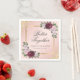 Elegant blush and burgundy floral wedding paper napkins featuring burgundy and blush pink roses framing the wedding details inside a gold frame adorned with gold confetti. Matching items available.