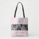 Blush Pink Photo Black Script Hair Stylist Tote Bag. A sophisticated business design with photo uploads. Clean and classic, chic black script on blush pink background, expressing a stylist specializing in timeless beauty. Add all your details and your best photos to represent your brand. Contact the designer for any customization questions. A lovely tote promotional item your customers will enjoy!