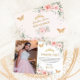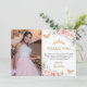 Detta stilrena Quinceañera tackkort har ömt vattenfärg rosa blommor, mjuk grönska lövverk och rosa fjärilar. Personifiera det med dina detaljer enkelt och snabbt, tryck bara på knappen för att anpassa och ändra stil och placering av texten. Även bra för Sweet 16, 18-årsdag, bröllop, baby shower och många fler tillfällen! (c) The Happy Cat Studio