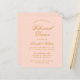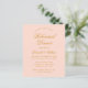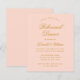 En enkel inbjudan till repetitionsmiddag med en modern färg: blush rosa. Den har bara guldbokstäver på rosa bakgrund. Orden "Rehearsal Dinner" och namnet är skrivna med en elegant kalligrafisk stil.