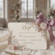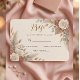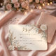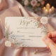 This design utilizes a sophisticated, formal layout centered around delicate watercolor illustrations of dusty rose blossoms and muted green eucalyptus leaves. The composition sits on a soft cream background , establishing a warm, inviting contrast with the elegant, sweeping script used for the primary headline and the highly legible classic serif font for the event details.This is a flat printed image with a faux metallic foil effect, not actual raised material.