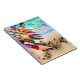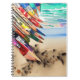 Bilden visar en spiralanteckningsbok tillsammans med pennor, mot en bakgrund av en strand. Scenen antyder en lekfull konstnärlig miljö, troligen riktad mot barn som ägnar sig åt konst eller skrivaktiviteter. Kombinationen av kontorsmaterial och strandmiljön skapar en intressant kontrast mellan kreativitet och natur.