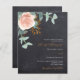 Bakgrund i kalktavla. Dekorerad med en blommigt för guld och rosa, blomma från ro och grönt, vattenfärgad eukalyptus löv, sprig, grönsak och faux ro sprig. Anpassa och lägg till namn och information. Vit och guldfärgad färgad. 1 lakan = 1 inbjudan tryckt kant till kant.