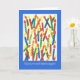 Ett kort med ljusa färgader, med ljus och Grattis på födelsedagen på danska, från en handmålad papper kollage av Judy Adamson.