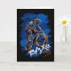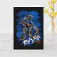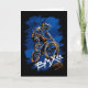 A bold BMX street-style illustration of a rider performing a trick, featuring dynamic blue and orange splashes with graffiti-inspired text reading “BMX – Urban City.”