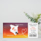 En rolig men stilren bröllopsinbjudan i stil med boardingkort/biljett för par som gifter sig utomlands i Kenya, Östafrika som visas i en vit kart-silhuett på en solnedgång orange gul lila tonad bakgrund med söta kärlekshjärtan, flygplanssilhuett och vita pärlor som virvlar in i en hjärtform. Baksidan av boardingkortet har två giraff-silhuetter framför en ljus solnedgång.