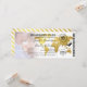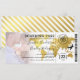 Boarding pass bröllopsbiljett med foto av det lyckliga paret, en guldpräglad världskarta över destinationen, kompass, flygplan och en personlig bröllopsmall.