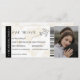 Modern minimalistisk påstigning med monogram passerar bröllop biljett med en enkel vit och brun bakgrund, ett foto av det förlovade paret, ett flygplan med en loopspår och en personlig sparar datummallen som är lätt att anpassa. Glöm inte att uppdatera monogramtexten på baksidan.