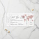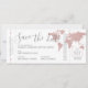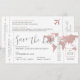 Destinationsbröllopet på världskartan i ro sparar det datum som ser ut som ett boardingkort flygplan biljett med en romantisk logotyp på flygplanet på baksidan. Alla uppgifter kan redigeras för alla typer av platser i party eller bröllop utomlands. Rosa och grått färg är perfekt för ett modernt och trendigets romantiska resetema.