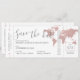 Destinationsbröllopet på världskartan i ro sparar det datum som ser ut som ett boardingkort flygplan biljett med en romantisk logotyp på flygplanet på baksidan. Alla uppgifter kan redigeras för alla typer av platser i party eller bröllop utomlands. Rosa och grått färg är perfekt för ett modernt och trendigets romantiska resetema.