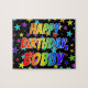 Den här slimmade, livliga, födelsetidsinställda pusselpusslet visar "GRATTIS PÅ FÖDELSEDAGEN, BOBBY" med tecknen som har ett färgstarkt regnbågsspektrum som inspirerar till gradienten mönster, tillsammans med en spännande stjärnornas bakgrund mönster. Ett färglöst pussel som det här kan användas för att skicka födelsedagspresent önskemål till någon som heter Bobby. [~Z0000468]