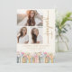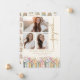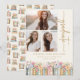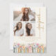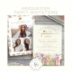 Examensmeddelande med boktema. Fira denna milstolpe med stil med ett personligt examensmeddelande som vackert visar upp tre av dina favoritfoton på framsidan, tillsammans med handmålade akvarellillustrationer av böcker och ömtåliga vår- och sommarsvårblommor i mjuka nyanser av rosa, blå, grön och guld. Den vintage skrivmaskinsstilen och det guldhandskrivna manuset på en elfenbensvit bakgrund ger en tidlös, litterär bibliotekskänsla. Det koordinerade mönstret på baksidan knyter samman designen för en polerad, elegant look. Anpassa formuleringen, typsnitt, storlekar och bakgrunder för att skapa en souvenir som verkligen speglar din resa. Dela din prestation med en design som är lika unik som din berättelse – börja anpassa idag! (