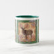 Här är en helgdagmugg med en manlig signalljus. En silhouette av en bockhjort blandar in i en solbränna, snowflakenågot liknandemönster, båda som centreras på en grön bakgrund. Silvriga brytningar smyckar tränga någon och att ge en blåst vind verkställer till den hela bilden. Sure att behaga.