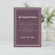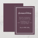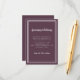 Enkelt elegant bröllopsinformationskort med minimalistisk design med en dubbel ramkant i krispigt vitt på en Cassis lila bakgrund. Traditionell formulering ger tidlös men modern förfining. Anpassa bröllopsdesignen med dina detaljer i krispigt vit bokstav och skrivstil. Baksidan av kortet matchar i enfärgat cassis lila.