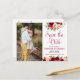 Bohemian Burgundy Marsala Blommigt Spara datumfotovykortet. Chic Bohemisk burgundi, marsala, rosa vattenfärgsro, botaniska blommigtens arrangemanga bröllop utformning med grönt löv på vit bakgrund. Använd en handskriven typografi för eleganten "Spara datum". Du kan anpassa meddelandets framsida med ditt favoritfoto, ditt namn och ditt bröllop-datum. Perfekten väljer fall eller vinter. 3335