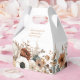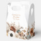 The favor box is adorned with a delicate floral motif that wraps gently around the bottom edge, creating a soft, organic frame. The arrangement features muted tones of ivory, beige, and terracotta, interwoven with sage green leaves and subtle brown accents. The composition is balanced and symmetrical, offering a refined aesthetic that complements the box’s clean lines and structured form. Each bloom is rendered with understated elegance, suggesting a timeless, natural theme suited to formal gatherings.