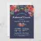 Blommigtens repetitionsmiddagsinbjudan mörk blått med blomsterarrangemang i orange, rött och shock rosa samt blått och oliv grönt löv.