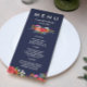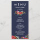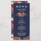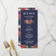 Mörk blått bröllop-meny med en färgstark blombukett av ro, daisy och paneler i orange, rosa och vitt. Baksidan har ett matchande blommönster.