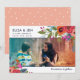 Blommigten sparar datumkortet med handdragna blomsterarrangemang i vackra färg-kombinationer - oliv grönt med orange och shock rosa och korall- och marinblått - i kombination med modern mörk blått typsnitt. Baksidan har en sprinkl av vita konfetti mot en ton.