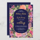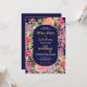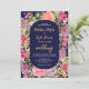 Bohemian bright blommigt Arch-chic-bröllopsinbjudan med söt hand målad ljus och djärv, modern vild blommor blandar en vintage med korallpeonier, lila blommor, rosa ros och grönsak med en botanisk boho temed bröllopsfest firande. Med modern manustypografi och guld och marinblått.