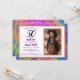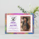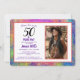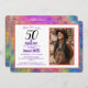 En roligt och vacker gult, orange, fechsia, blå, grönt nebula abstrakt digital målning 50:e födelsedagsfotoinbjudan, med lila och svart typografi som du kan anpassa för att skicka ut till andra inbjudan för att fira din femtionde födelsedagsfest med dig. Lila med uppgifter om namn, datum, klockslag, adress och kontakt kan ändras och personlig ändras, och exempelfotot kan bytas ut mot ditt eget. Kortets baksida dekoreras av den vackra fullt av abstraktens moderna digitala målningsverk från Kosmosis Art.