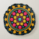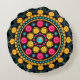 Round bohemian style throw pillow in bright multi-colors against a black background.