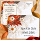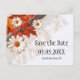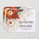 Ett modernt design Spara datum-kort med färgglada höstlöv och tusenskönor på ett spetsigt elfenbensfärgat träd bakgrund.