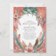 Denna bohemiska bröllopsinbjudan har en delikat krans av fjädrar, blad och blommor som omger ett centralt textområde, med en drömfångare som tillför en nyckfull touch. Mot en mjuk korallbakgrund skapar de jordnära tonerna och naturliga elementen en lugn och fri atmosfär, perfekt för ett boho-inspirerat bröllop. Denna design fångar essensen av en avspänd, naturälskande fest, idealisk för par som söker en unik och avspänd bröllopsstil.